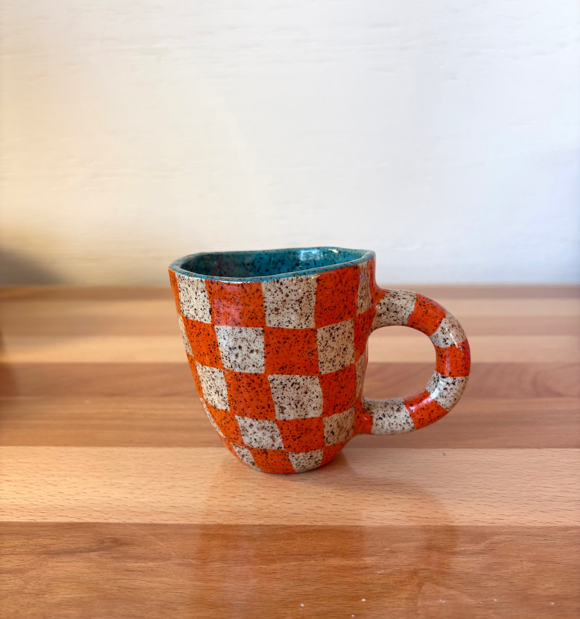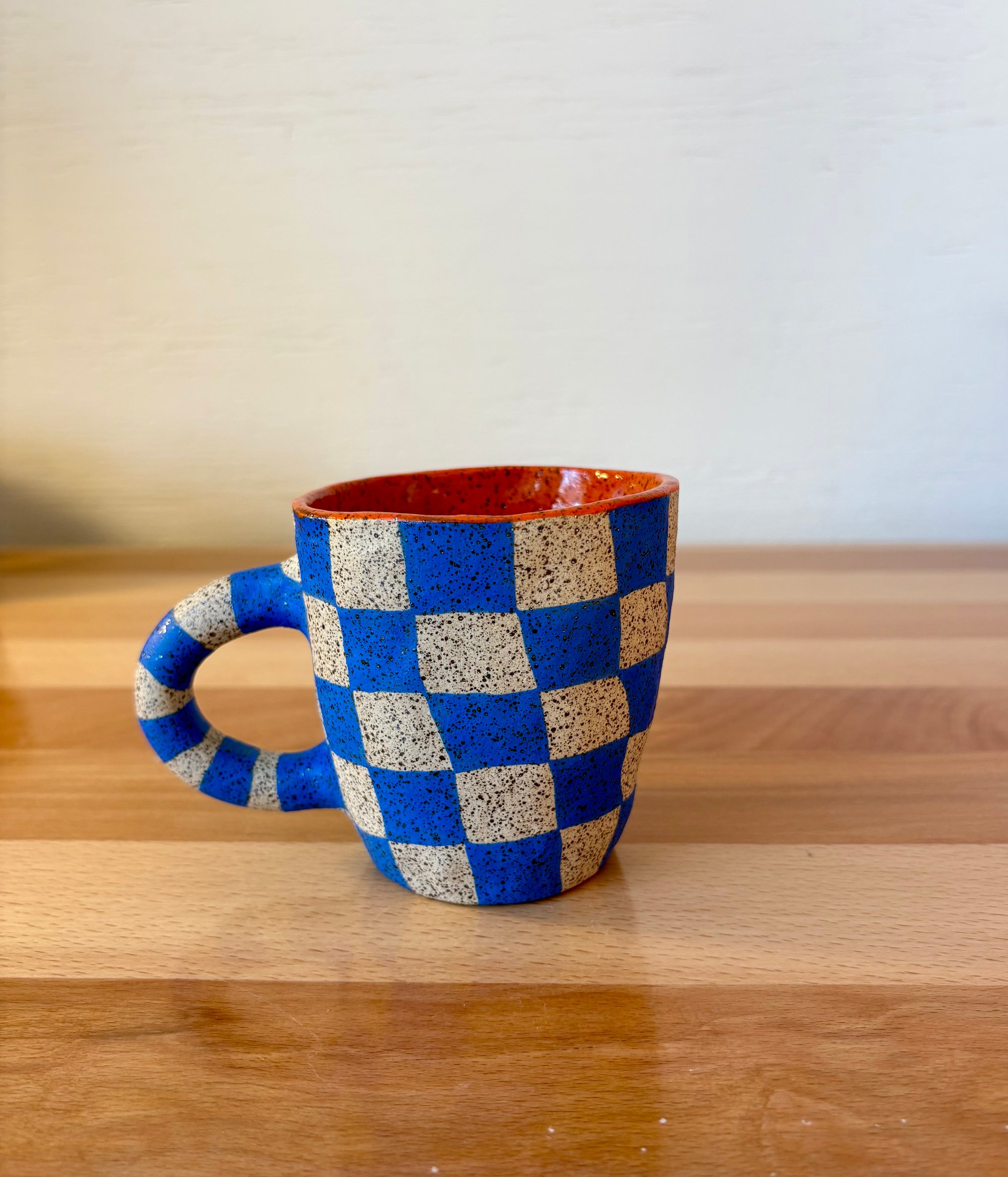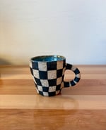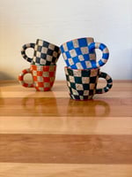 hand pinched mug with hand painted checker design