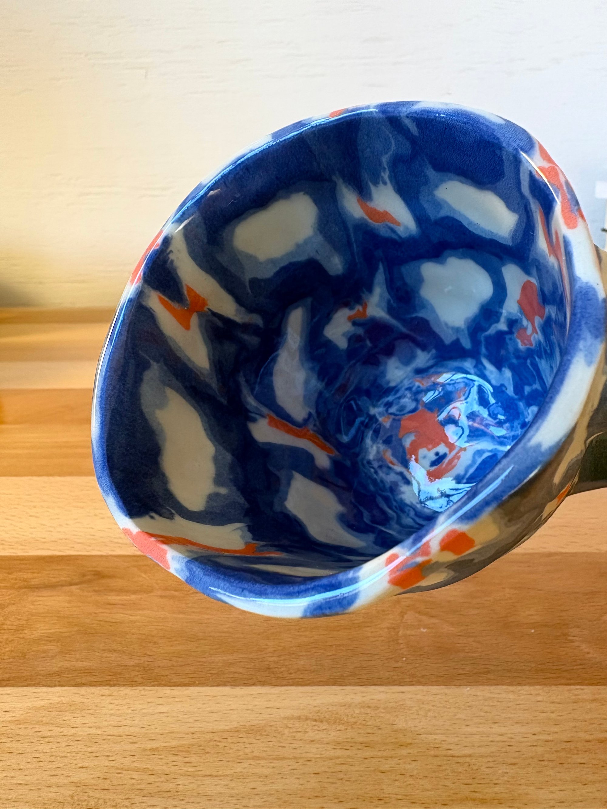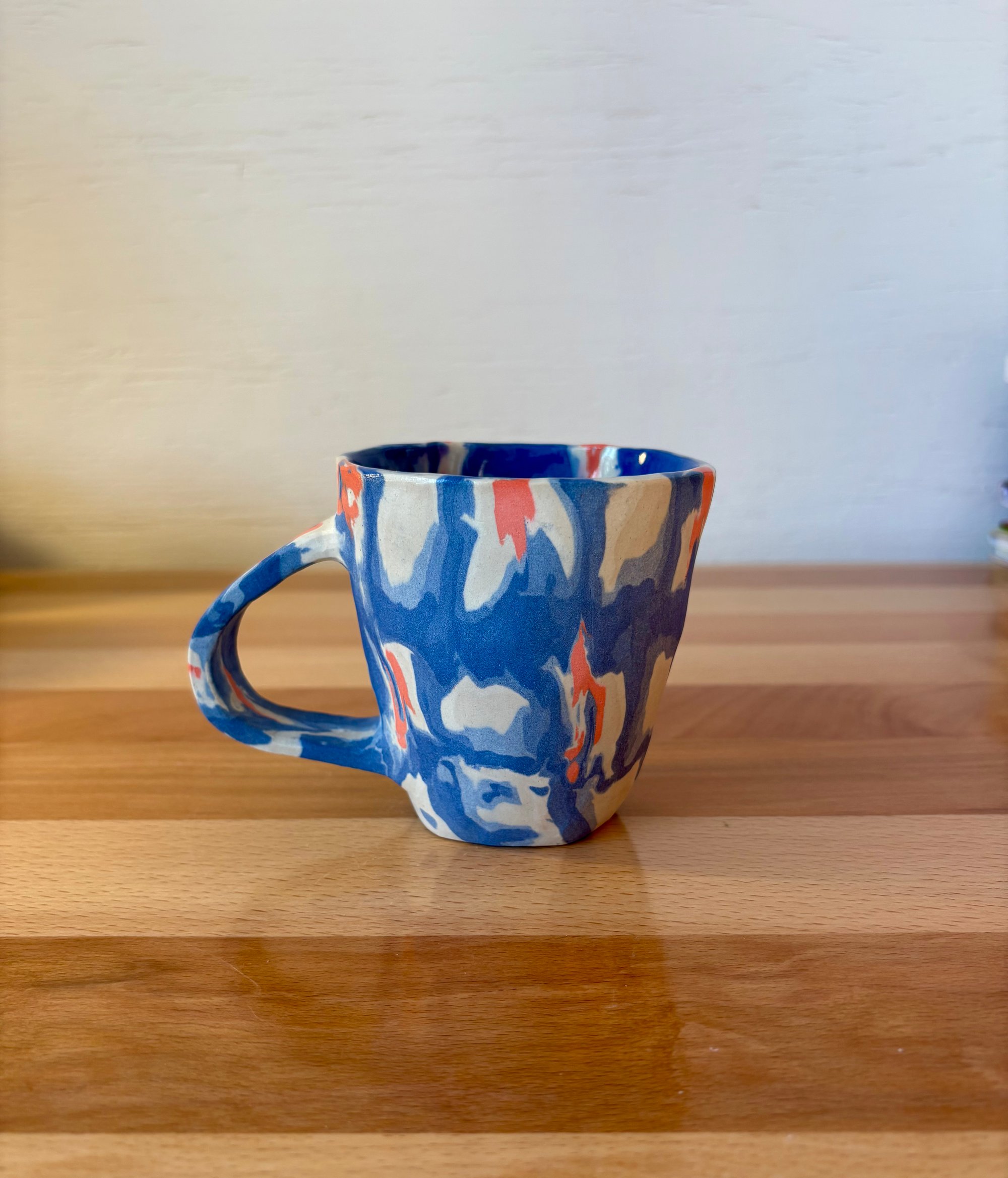 Hand built mug using Nerikomi colored clay technique, all done by hand, inside and outside are the same. Matte on the outside, glazed on the inside.